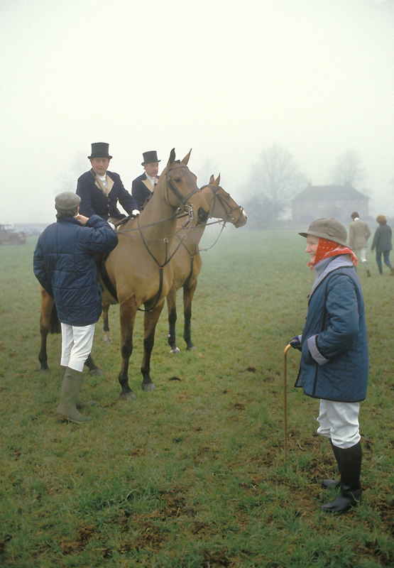 Fox hunting, the Duke of Beaufort hunt. A break during the days hunting and a change of horses. Badminton, Gloucestershire, England circa November 1985. (Photo Homer Sykes)