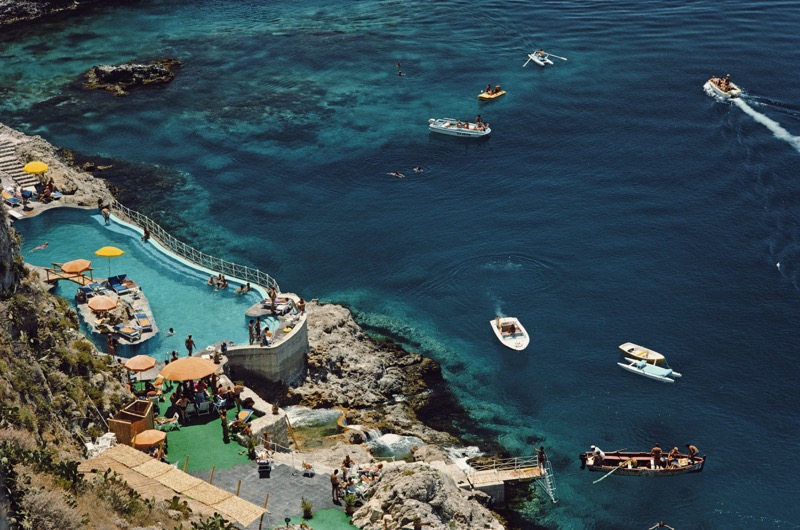 Note this image is available as a Limited Edition Estate Stamped Print (edition size 1/150). The seaside swimming pool at the Hotel Taormina in Taormina, Sicily, August 1975. (Photo by Slim Aarons)