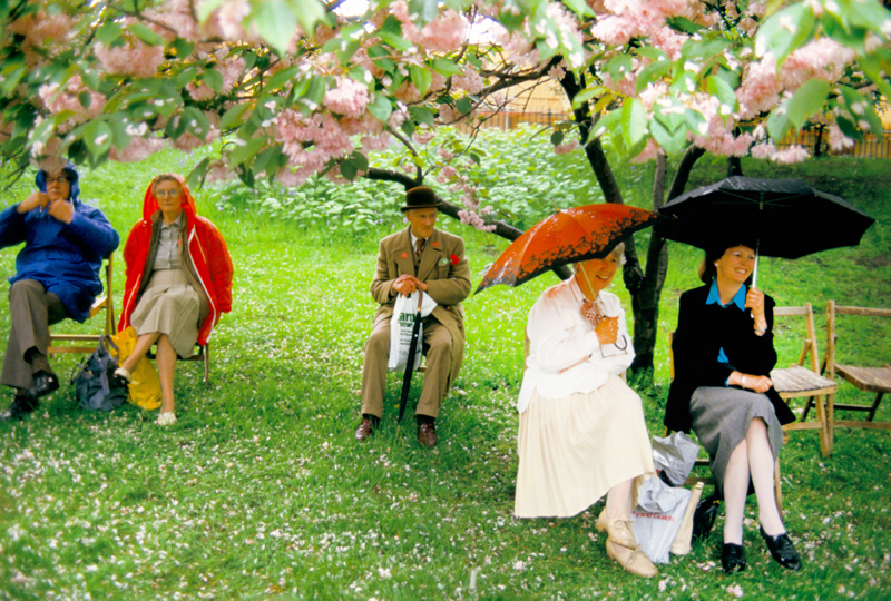 Visitors sheltering from bad weather at the Chelsea Flower Show, London, UK, 1980s. (Photo Homer Sykes)