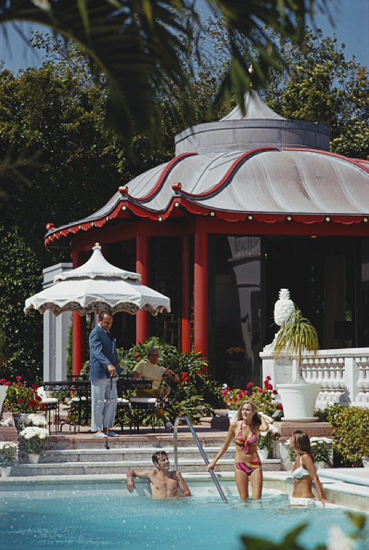 Mrs. Lee Kinsolving (formerly Lee Crawford) descending the steps into the pool at Albin Holder’s home, Palm Beach, Florida, May 1970. (Photo by Slim Aarons)