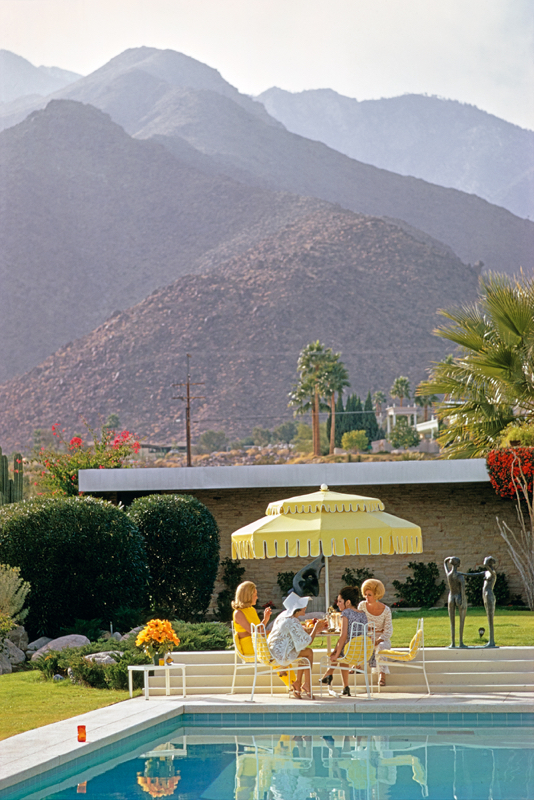 Nelda Linsk (left, in yellow), wife of art dealer Joseph Linsk with guests by the pool at the Linsk’s desert house in Palm Springs, January 1970. At centre, left is actress Lita Baron (in white sunhat) and at far right is former fashion model Helen Dzo Dzo Kaptur. (Photo by Slim Aarons