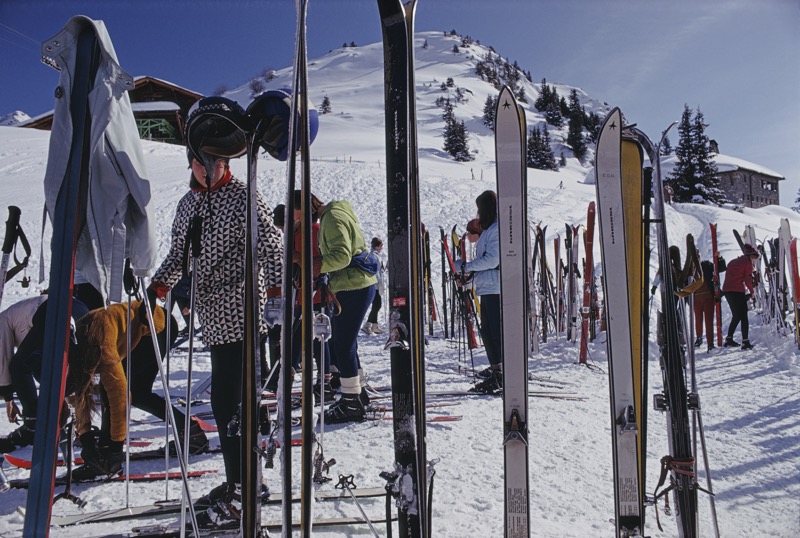 Note this image is available as a Limited Edition Estate Stamped Print (edition size 1/150). Skiers at Gstaad, Switzerland, 1969. (Photo by Slim Aarons)