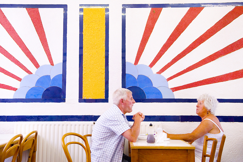 An English sunrise motif in a cafe Southend on Sea, Essex. England. 2006. Baileys Fish and Chip shop. (Photo Homer Sykes)