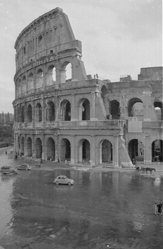 Hoses have been used to recreate rain outside the Colosseum during the filming of Renato Castellani’s ‘Under The Roman Sky’. Original Publication: Picture Post – 4529 – Makers Of The World’s Best Films – pub.1948
